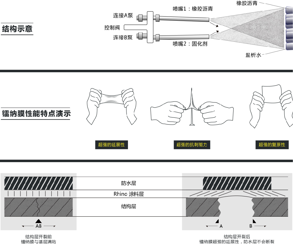 高彈性、高延展性,無(wú)開(kāi)裂、脫落等造成的滲漏隱患