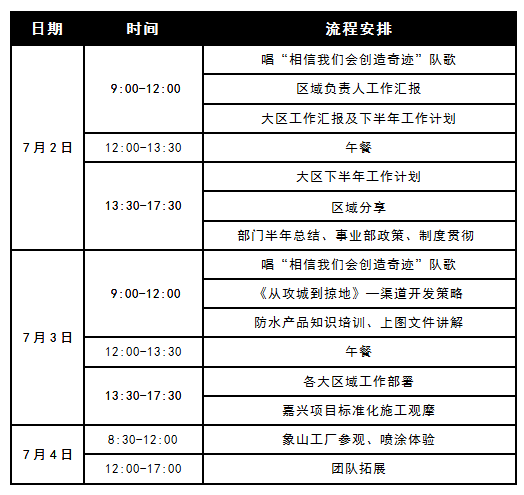 各匯報人員均對上半年的工作做出了深刻總結(jié),指出了目前工作中存在的亮點和不足,并提出了改進(jìn)措施 ,另外還進(jìn)行了2018年上半年公司經(jīng)營數(shù)據(jù)分析、渠道開發(fā)策略方面的培訓(xùn)、防水知識方面的技術(shù)培訓(xùn)等。會議第三天全體人員前往嘉興某大型工業(yè)廠房進(jìn)行實地觀摩和團(tuán)建活動。